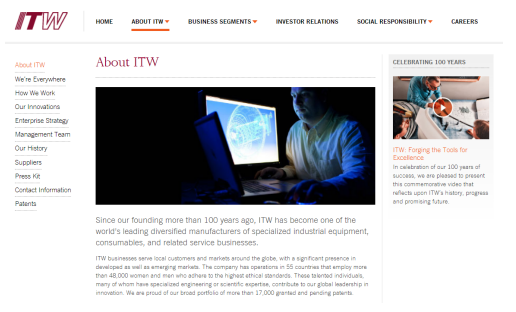 美國(guó)ITW(IllinoisToolWorks)集團成立於1912年,是美(měi)國《Fortune》雜誌所評鑒的(de)500強公司之一,公司業(yè)務涵蓋建築,機械,化(huà)工,食品,石油等行業。